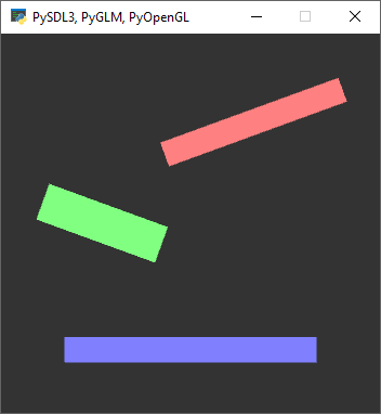 It is a very simple example for beginners that shows how to draw a few rotated rectangles using OpenGL ES 3.0 in Python and PySDL3. There are more examples in OpenGL here: Simple OpenGL examples for beginners in PySDL3